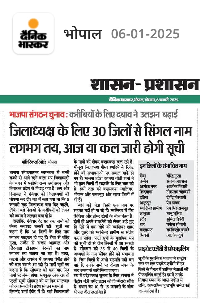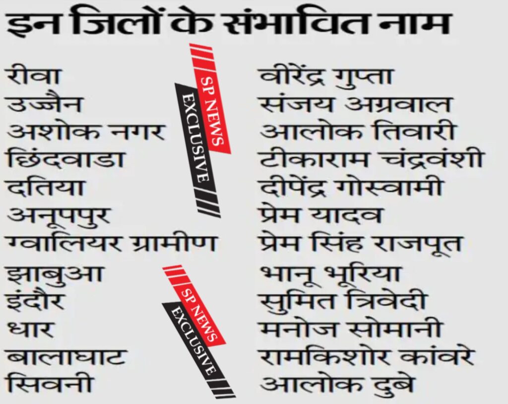 कुछ जिलों में भाजपा जिलाध्यक्ष लिए संभावित नाम आए सामने Post navigation महाराणा की प्रतिमा की पांच कन्याओं ने की पूजा अर्चना- न कोई जीता न हारा- गहमा गहमी का माहौलभाजपा जिला अध्यक्ष के लिए धार मनोज सोमानी, झाबुआ भानु भूरिया, देवास राजेश यादव, श्योपुर अरविंद जादोंन सहित 50 जिले मे सिंगल नाम