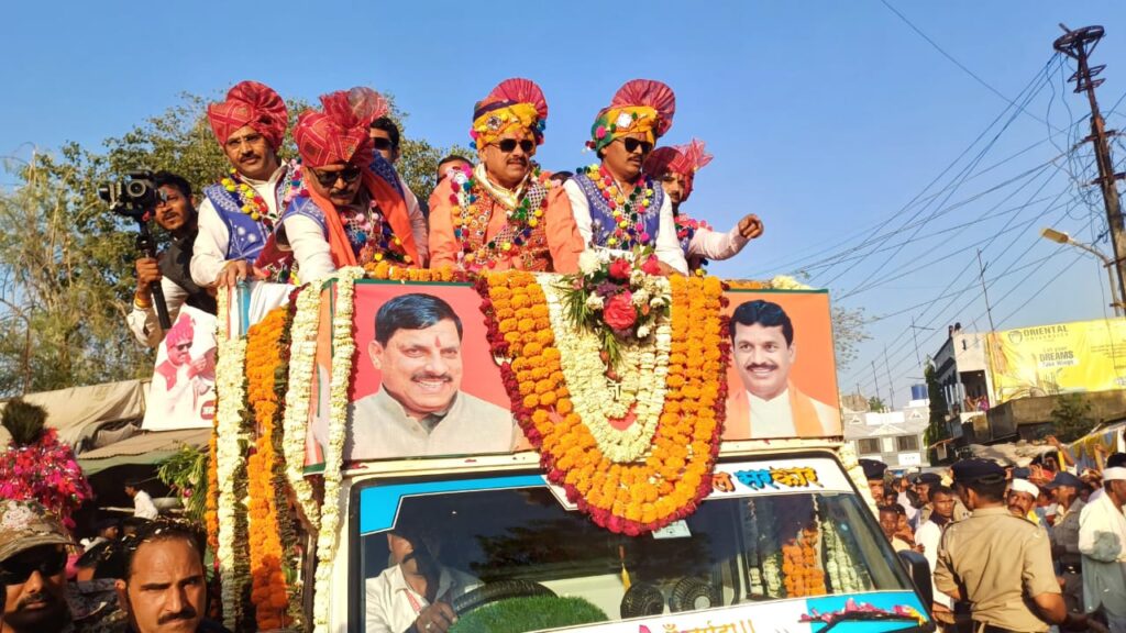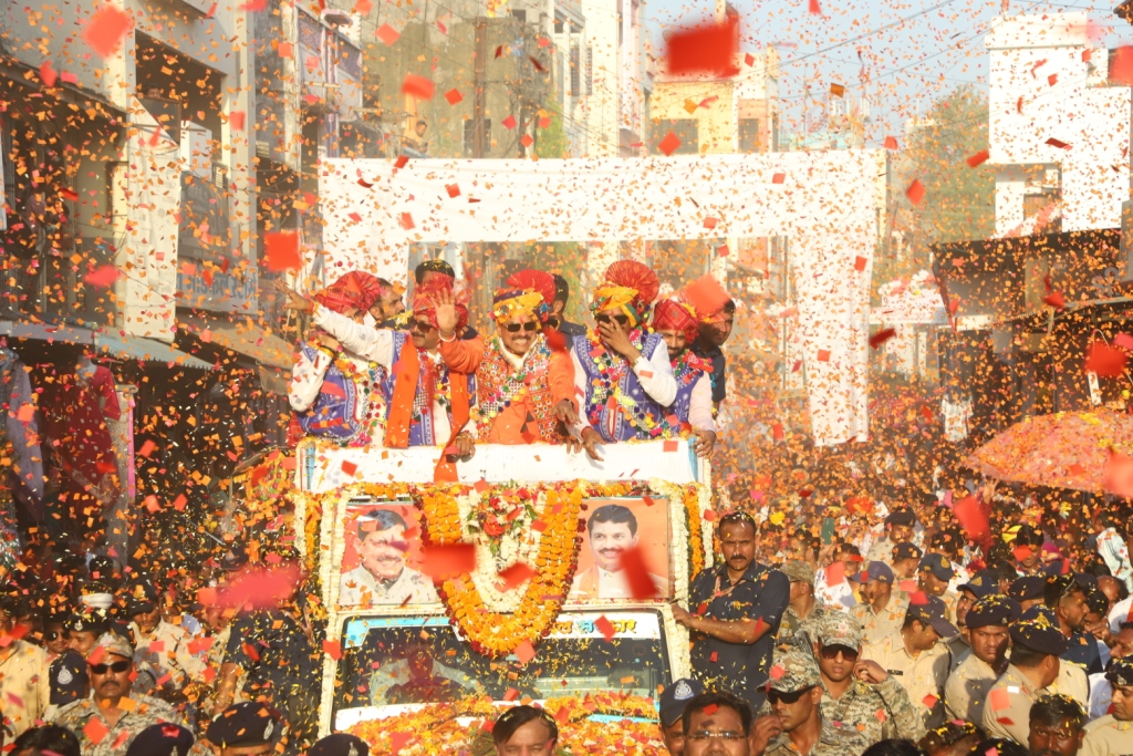 इस दौरान मुख्यमंत्री जी का भव्य स्वागत नगर वासियों के द्वारा किया गया। नगरवासियों ने अपनी दुकान, घरो, खिड़कियों, छतों, चौराहे से फूलो के द्वारा मुख्यमंत्री जी का भव्य स्वागत किया। नगरवासियों के स्नेह से सरोबार होकर मुख्यमंत्री जी ने भी नगर वासियों पर फूलों की वर्षा की। ढोल-मांदल बजाने वालों को किया पुरस्कृत मंच के कार्यक्रम के दौरान मुख्यमंत्री डॉ. मोहन यादव ने उनके स्वागत में आये स्थानीय ढोल-मांदल बजाने वाले समूहो की प्रशंसा करते हुए कहा कि ढोल मांदल की थाप सुनकर मन प्रफुल्लित हो उठा।