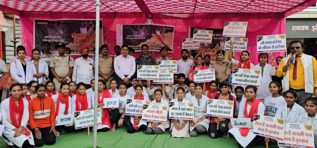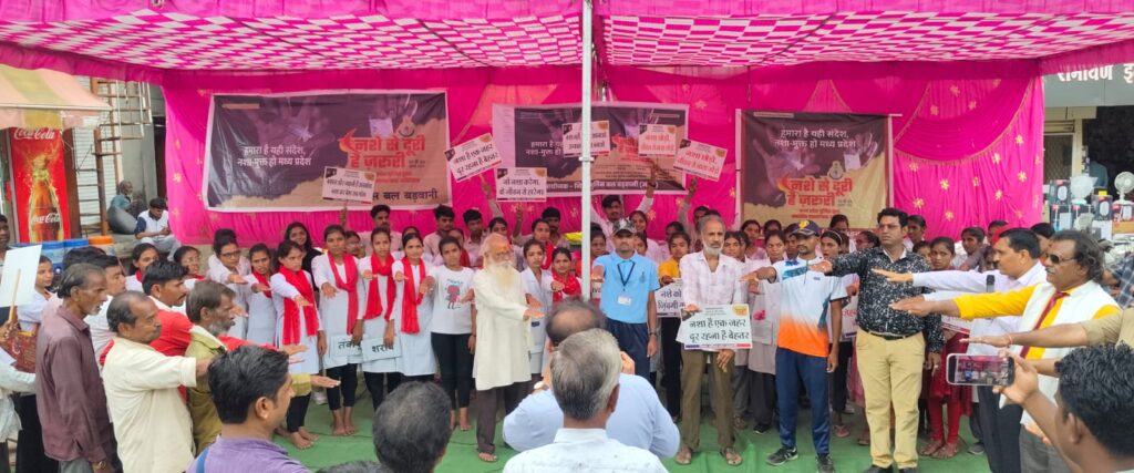 इस अभियान की कड़ी में सरस्वती नर्सिंग कॉलेज बड़वानी के विद्यार्थियों द्वारा रंजीत चौक, बड़वानी में एक सशक्त नुक्कड़ नाटक का मंचन किया गया। नाटक में यह दर्शाया गया कि नशा व्यक्ति को मानसिक और शारीरिक रूप से कमजोर करता है तथा उसका सीधा दुष्प्रभाव परिवार और समाज पर भी पड़ता है। मार्मिक संवादों और जीवंत अभिनय के माध्यम से युवाओं ने यह संदेश दिया कि नशा सिर्फ व्यक्ति नहीं, उसकी पूरी पीढ़ी को प्रभावित कर सकता है। कार्यक्रम के दौरान आम नागरिकों को नशा मुक्ति से संबंधित पंपलेट वितरित किए गए और शहर के विभिन्न क्षेत्रों में जागरूकता पोस्टर लगाए गए। इस अवसर पर स्वयं ’पुलिस अधीक्षक श्री जगदीश डावर उपस्थित रहे। उन्होंने उपस्थित नागरिकों को नशे से दूर रहने की शपथ दिलाई और कहा कि नशा एक ऐसा धीमा ज़हर है जो व्यक्ति के भविष्य को खत्म कर देता है। उन्होंने यह भी स्पष्ट किया कि पुलिस आमजन की मित्र है, और नशा छोड़ने की राह में कोई भी व्यक्ति पुलिस से बेहिचक संपर्क कर सकता है।