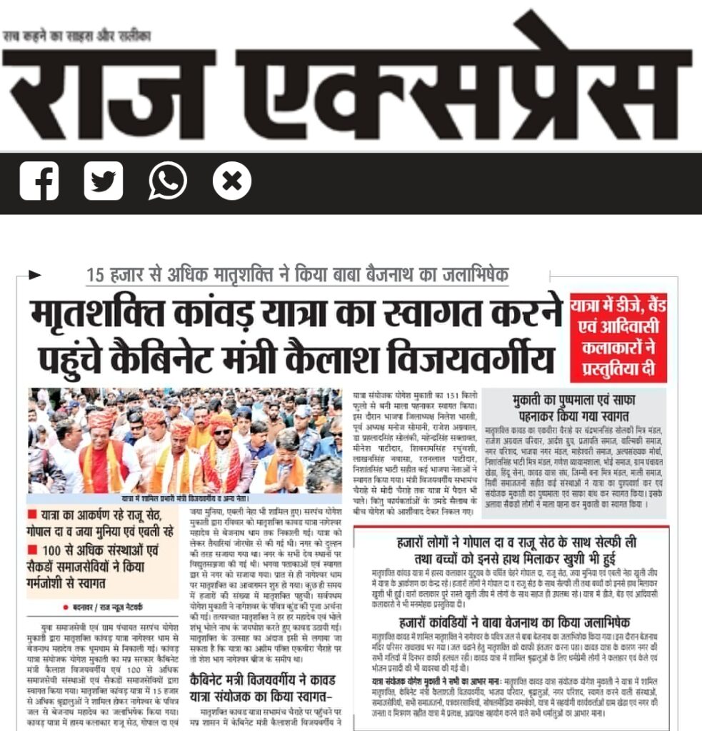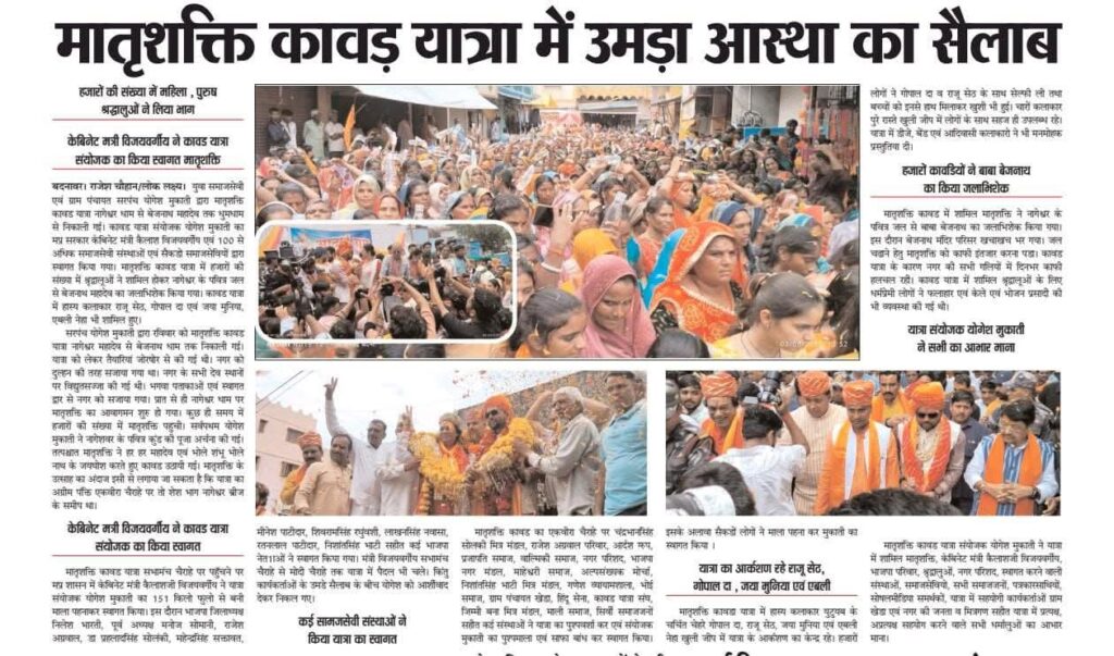 संस्था द्वारा नि:स्वार्थ भाव से कावड़ियों की सेवा की जा रही है। यदि कोई बीमार तकलीफ में होता है तो उसकी भी मदद करते हैं। प्रहलाद यादव, नरेंद्र तिवारी, अमित शर्मा, अनय देशमुख, सागर जोशी, संजय निम्भोरकर, विनायक निम्भोरकर आशीष गुप्ता आदि का विशेष सहयोग रहता है।