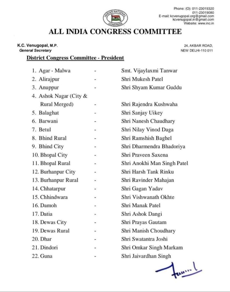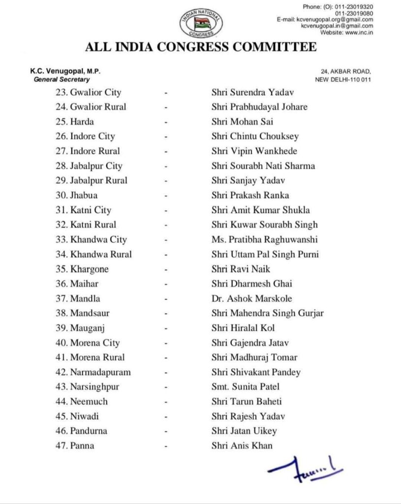 ब्रेकिंग न्यूज़– कांग्रेस के जिलाध्यक्षो की हुई घोषणा, धार से स्वतंत्र जोशी