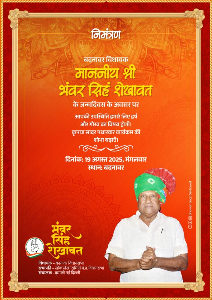 बदनावर/विधायक भंवरसिंह शेखावत का जन्मदिन कार्यकर्ताओं द्वारा धूमधाम से मनाया जाएगा। जन्मदिन कार्यक्रम मंगलवार को चंद्रलीला पैलेस में आयोजित किया जाएगा। जन्मदिन कार्यक्रम में मुख्य अतिथि नेता प्रतिपक्ष गंधवानी विधायक उमंगजी सिंघार होगे। इस अवसर पर नव नियुक्त कांग्रेस धार जिलाध्यक्ष स्वतंत्र जोशी का कार्यकर्ताओं द्वारा स्वागत व सम्मान किया जाएगा। विधायक शेखावत के जन्मदिन अवसर पर विधायक निधि से 400 दिव्यांग व विकलांग अन्य हितग्राहियों को चेक वितरण एवं 23 ग्राम पंचायत को पानी के टेकर का वितरण भी किया जाएगा।