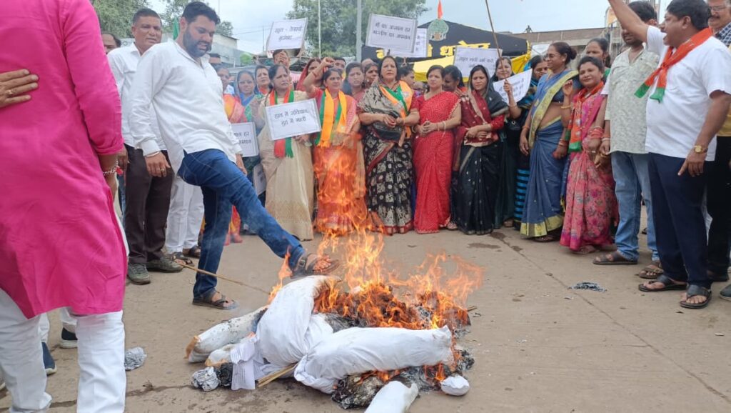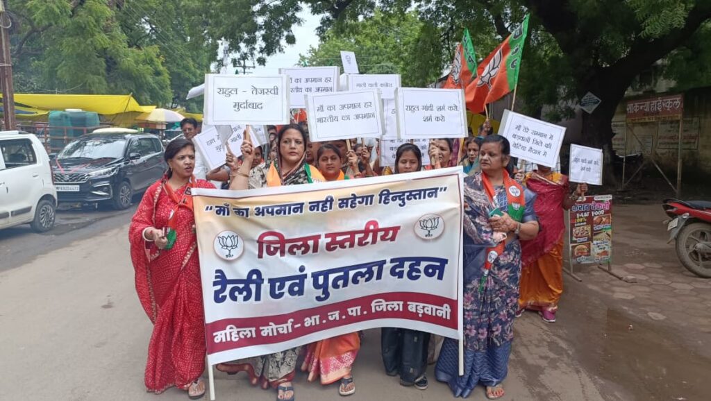बड़वानी (नरेन्द्र गुप्ता):- जिला भाजपा महिला मोर्चा के तत्वावधान में जिला मुख्यालय पर भाजपाइयों ने कांग्रेस के खिलाफ रैली निकाल कर झंडा चौक स्थित कांग्रेस कार्यालय का घेराव किया व Ministry करते हुए राहुल गांधी एवं तेजस्वी यादव का पुतला फूंका।