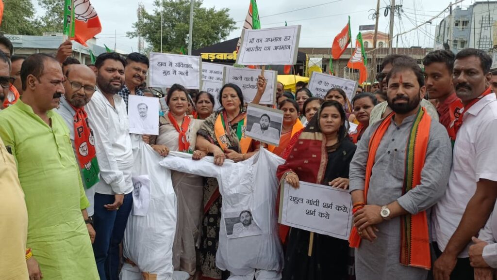 कांग्रेस कार्यालय के सामने महिला मोर्चा जिला अध्यक्ष लक्ष्मी शर्मा व पूर्व जिला अध्यक्ष ओमप्रकाश खंडेलवाल ने सम्बोधित करते हुए कांग्रेस पार्टी को आड़े हाथों लेते हुए कहा कि महिलाओं का अपमान करना कांग्रेस की नियति बन गई है। कांग्रेस के प्रदेश अध्यक्ष जीतू पटवारी ने भी पिछले दिनों प्रदेश की महिलाओं के ऊपर अपमान जनक टिप्पणी की थी। राहुल गांधी व कांग्रेस पार्टी को देश की महिलाओं से माफी मांगनी चाहिए।