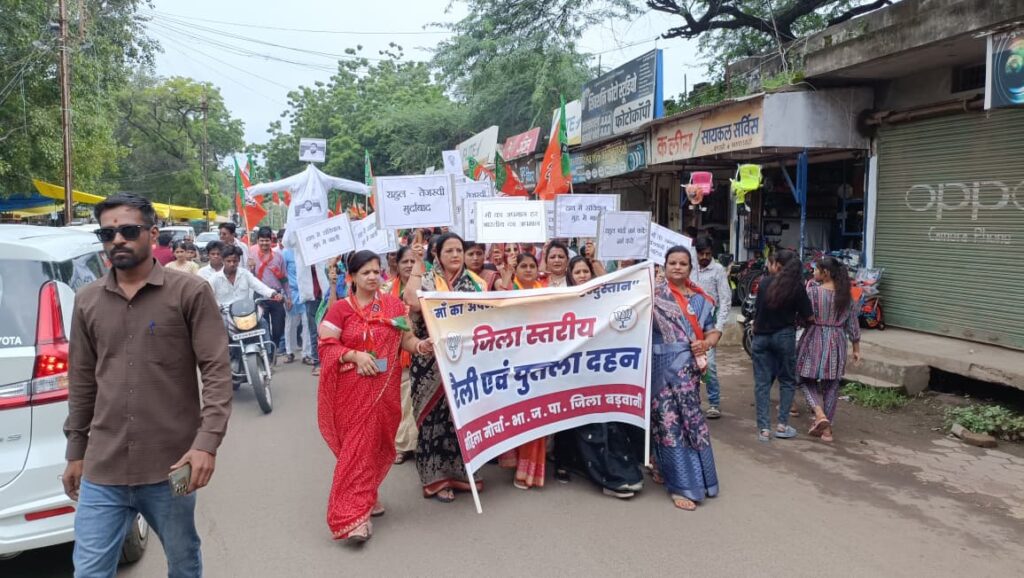 रैली में महिलाओं ने हाथों माँ तेरे सम्मान में बड़वानी जिले की बेटियां मैदान में, महिलाओं का अपमान नही सहेगा हिन्दुस्तान, हाथ मे संविधान मुंह मे गाली आदि नारे लिखी पट्टिकाएं लेकर चल रही थी वही पुरुष भाजपा का झंडा लिए रैली में शामिल थे।
