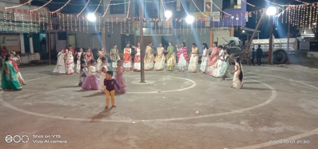 फिर रंगारंग डांडिया नृत्य का दौर आरंभ होता नन्ही नन्ही बालिकाओं से लगाकर नगर की माताओं युवतियों के द्वारा नव दिनों तक अलग-अलग परिधानों में रंगारंग गरबो की प्रस्तुतियों ने माता रानी की भक्ति का जज्बा जगाया रंग-बिरंगी लाईटींग से मैया का पांडाल सजाया गया था। बड़ी संख्या में श्रद्धालुओं ने खूब आनंद लिया इस वर्ष नवरात्रि एक बोनस लेकर आई थी तो दस दिन तक डांडिया रास चला। नवमी को हवन पूजन किया गया। मैया को गाजे-बाजे के साथ भावभीनी बिदाई दी गई बागरड़ी नदी पर मूर्ति का विसर्जन किया गया।