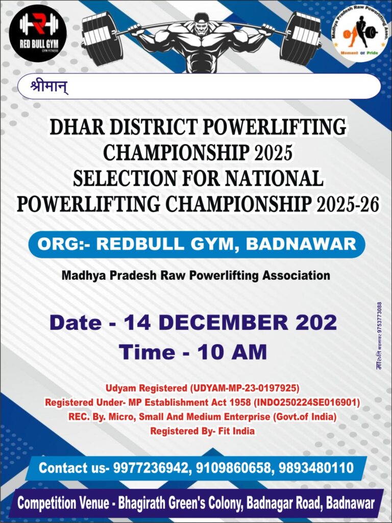 बदनावर।मध्य प्रदेश पावरलिफ्टिंग संगठन के तत्वाधान में रेड बुल जिम बदनावर द्वारा रविवार 14 दिसंबर को प्रातः 10 बजे भागीरथी ग्रीन कॉलोनी बड़नगर रोड बदनावर पर धार जिला पावरलिफ्टिंग चैंपियनशिप 2025 का आयोजन किया जाएगा। आयोजन में बदनावर, धार, नागदा, कानवन ,राजगढ़ सहित समूचे जिले के 70 से अधिक प्रतियोगी प्रतियोगिता में शामिल होंगे। प्रतियोगिता में शामिल पावर लिफ्टिंग खिलाड़ियों का चयन नेशनल पावर लिफ्टिंग चैंपियनशिप 2025, 26 के लिए किया जाएगा। रेड बुल जिम बदनावर के संचालक सोनू होती ने नगर की जनता से अपील की है कि अधिक से अधिक संख्या में भागीरथी ग्रीन कॉलोनी बदनावर पर पहुंचकर चैंपियनशिप प्रतिभागियों की प्रतियोगिता देखने के लिए उपस्थित रहे।
