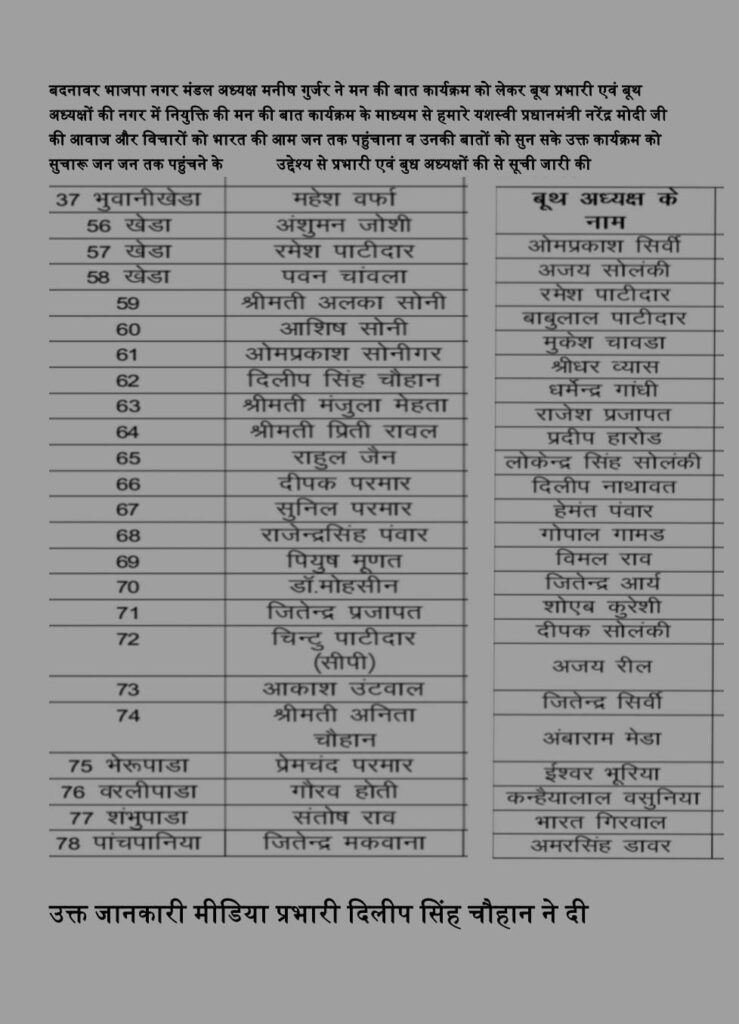 बदनावर । भाजपा नगर मंडल अध्यक्ष मनीष गुर्जर ने मन की बात कार्यक्रम को लेकर बूथ प्रभारी एवं अध्यक्षों की नगर में नियुक्ति की गई। मन की बात कार्यक्रम के माध्यम से यशस्वी प्रधानमंत्री नरेंद्र मोदी जी की आवाज और विचारों को भारत की आम जनता तक पहुंचाना व उनकी बातों को सुन सके। उक्त कार्यक्रम को संचारू जन जन तक पहुंचाने के उद्देश्य से प्रभारी एवं बुध अध्यक्षों की घोषणा की गई प्रभारी एवं बूथ अध्यक्षों की सूची की जानकारी नगर मंडल मीडिया प्रभारी दिलीप सिंह चौहान ने दी